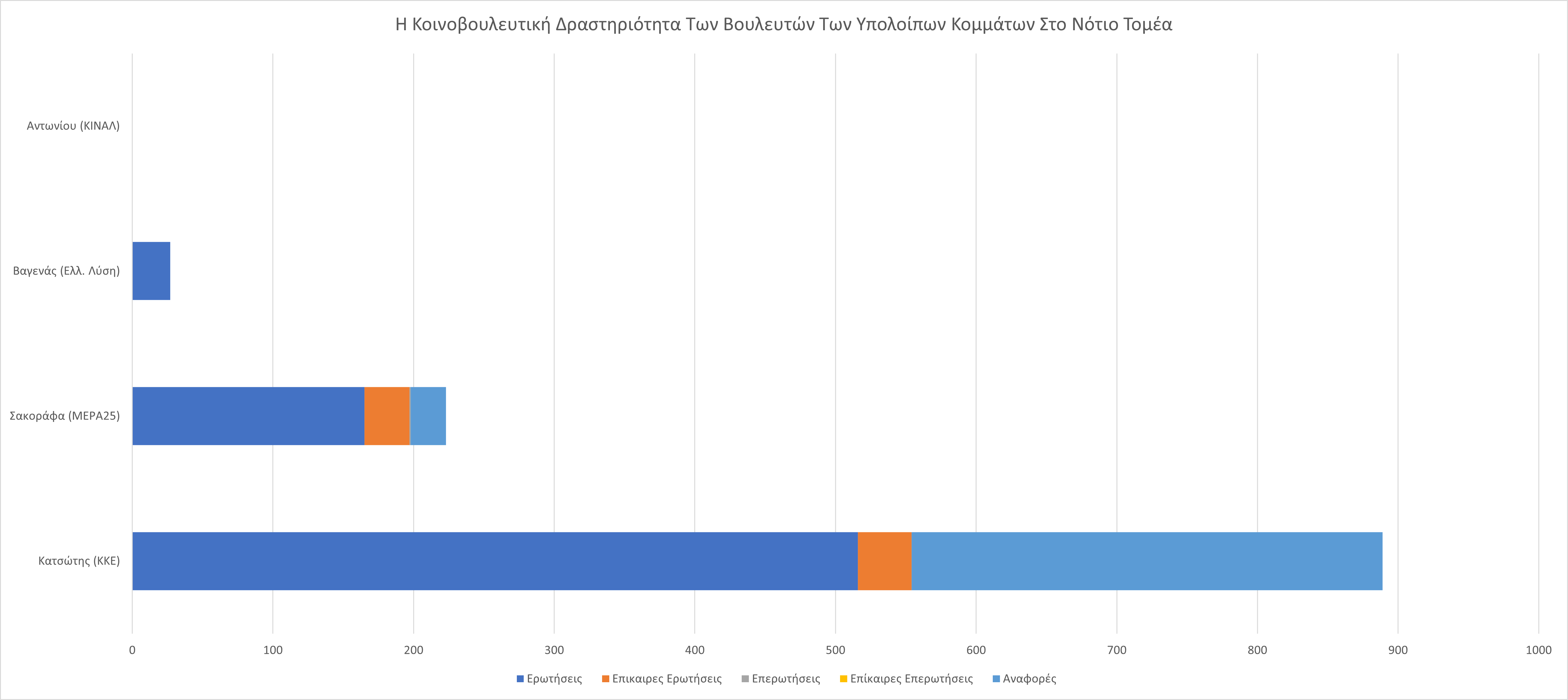 Από τους βουλευτές των υπόλοιπων κομμάτων που δραστηριοποιούνται στα νότια, τα πρωτεία σε κοινοβουλευτική δράση κατέχει ο βουλευτής του ΚΚΕ κ. Κατσώτης, με 516 ερωτήσεις, 38 επίκαιρες ερωτήσεις και 335 αναφορές. Ακολουθούν η βουλευτής του Μέρα25 κ. Σοφία Σακοράφα με 165 ερωτήσεις, 32, επίκαιρες ερωτήσεις, 1 επερώτηση και 25 αναφορές καθώς και ο κύριος Βαγενάς της Ελληνικής Λύσης με 27 ερωτήσεις. Κύριες θεματικές των ερωτήσεων των βουλευτών των υπολοίπων κομμάτων είναι η οικονομία, η παιδεία και η έρευνα, καθώς και τα ασφαλιστικά.