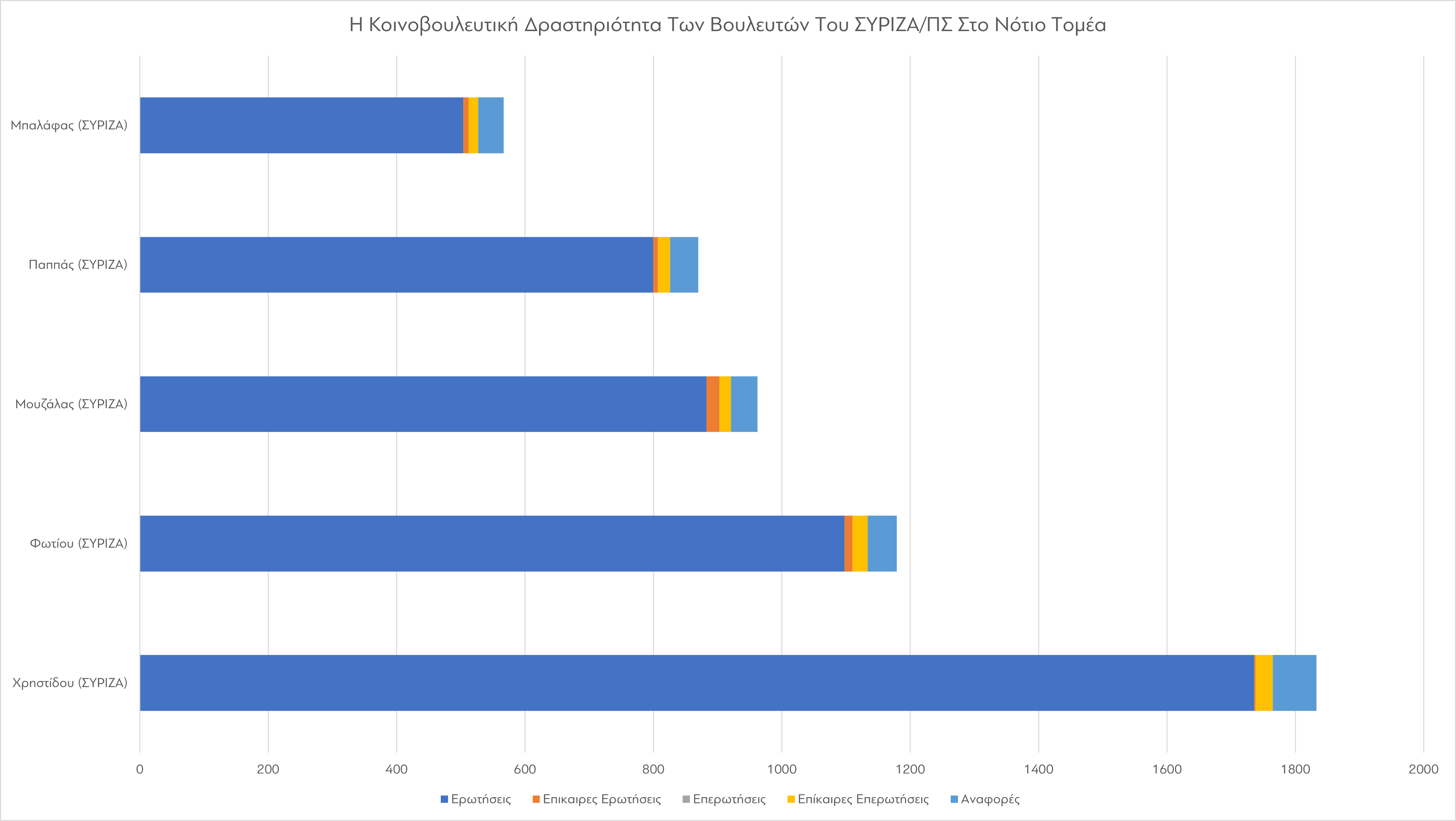 Ποιοι είναι οι πιο δραστήριοι βουλευτές του Νότιου Τομέα στη Βουλή; Πόσες ερωτήσεις έχουν καταθέσει για θέματα που απασχολούν τους πολίτες και ποιες είναι οι κύριες θεματικές των παρεμβάσεών τους; Το NouPou παρουσιάζει τα στατιστικά δεδομένα.