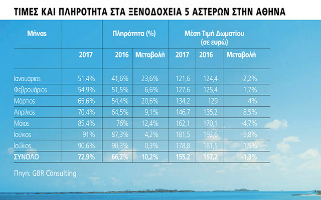 Οι πολυτελείς αλυσίδες ποντάρουν σε μια αγορά όπου αυτή τη στιγμή υπάρχει «κενό» και περαιτέρω περιθώρια ανόδου των τιμών. Ενδεικτικά, με βάση τα τελευταία στοιχεία της γνωστής εταιρείας GBR Consulting για τις τιμές στα ξενοδοχεία 5 αστέρων της Αθήνας, μεταξύ των οποίων τα «Μεγάλη Βρεταννία», «King George», «Ηilton», «Ιntercontinental», «Electra Palace», «Electra Metropolis», «Wyndham Grand», «New Hotel» κ.ά., η μέση τιμή δωματίου τον φετινό Ιούλιο ήταν στα 179 ευρώ, από 181 ευρώ τον Ιούνιο. Στο επτάμηνο του 2017 η Μέση Τιμή Δωματίου ήταν στα 155 ευρώ, οριακά μειωμένη κατά 1,3% σε σχέση με τα 157 ευρώ του 2016, ενώ αυξημένη ήταν η πληρότητα -σχεδόν στο 73%- για το επτάμηνο, από 66,2% του περυσινού επταμήνου. Το δίμηνο Ιουνίου – Ιουλίου οι πληρότητες στα 5άστερα της Αθήνας ξεπέρασε το 90%, ενώ συνολικά στο επτάμηνο του 2017 η μεταβολή σε επίπεδο πληρότητας διαμορφώθηκε στο 10,2%.