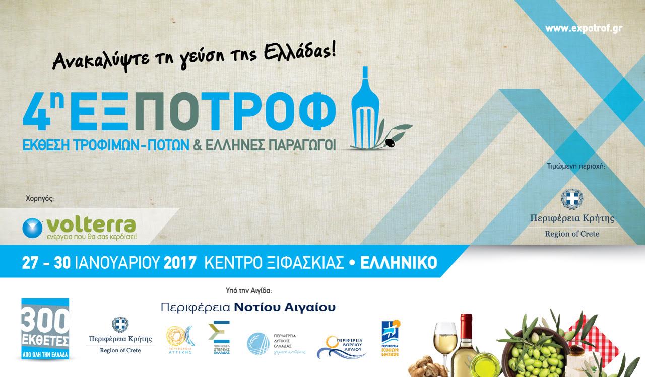 Για τέταρτη συνεχόμενη χρονιά η έκθεση που είναι αφιερωμένη στον κλάδο των ελληνικών τροφίμων και ποτών, σας προσκαλεί να γνωρίσετε από κοντά τα ποιοτικά προϊόντα της χώρας μας και τους παραγωγούς τους. Η ΕΞΠΟΤΡΟΦ είναι μια ολοκληρωμένη έκθεση που απευθύνεται τόσο σε επαγγελματίες του κλάδου όσο και στο κοινό και συγκεντρώνει κάθε χρόνο το ενδιαφέρον χιλιάδων επισκεπτών από την Ελλάδα και το εξωτερικό. Από τις 27 έως τις 30 Ιανουαρίου περισσότεροι από 40.000 επισκέπτες θα έχουν την ευκαιρία να ζήσουν από κοντά ένα πραγματικό γευστικό ταξίδι στην πατρίδα μας όπου οι ιδιώτες θα μπορούν να βρουν σπάνια, εξειδικευμένα προϊόντα μοναδικής ποιότητας και να κάνουν τις αγορές τους απευθείας από 300 επιλεγμένους εκθέτες, ενώ παράλληλα οι επιχειρηματίες θα κάνουν χρήσιμες επαγγελματικές επαφές ανοίγοντας στην επιχείρησή τους νέες προοπτικές.