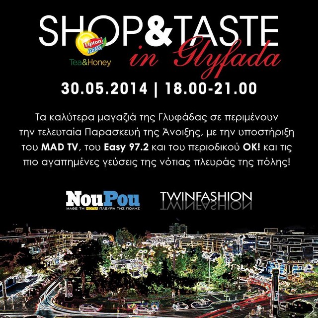 Η Γλυφάδα καλωσορίζει το πρώτο Shop & Taste event και το Nou-Pou.gr μαζί με το TwinFashion υπόσχονται ένα υπέροχο απόγευμα μόδας και γεύσης. Την όμορφη διοργάνωση συντονίζει η ειδική σε τέτοιου είδους events Follow me.