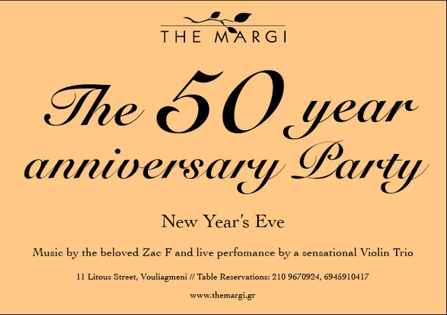 Στο κλείσιμο μιας επετειακής χρονιάς, καθώς συμπληρώνει 50 χρόνια παρουσίας στην Αθηναϊκή Ριβιέρα, το αγαπημένο ξενοδοχείο The Margi, συνώνυμο της ζεστής φιλοξενίας και της καλής διάθεσης, φοράει τα γιορτινά του και ετοιμάζεται να υποδεχτεί την καινούργια χρονιά με ένα αξέχαστο πάρτυ, το “The 50 year anniversary party” @ The Margi.