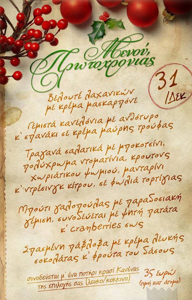 To Living βάζει και πάλι τα καλά του και ετοιμάζεται να μας υποδεχτεί για το εορταστικό ρεβεγιόν. Όπως και τα Χριστούγεννα, έτσι και την Πρωτοχρονιά με ένα μενού που θα μας κάνει να γλείφουμε τα δάχτυλα μας. Τα πιάτα περιλαμβάνουν για ορεκτικό μια βελουτέ σούπα λαχανικών με κρέμα μασκαρπόνε, εν συνεχεία γεμιστά κανελόνια με ανθότυρο και σπανάκι σε κρέμα μαύρης τρούφας, τραγανά σαλατικά με μποκοτσίνι, πολύχρωμα ντοματίνια και μανταρίνι σε φωλιά τορτίγιας και για κυρίως πιάτο μπούτι γαλοπούλας με την παραδοσιακή γέμιση. Συν ένα ποτήρι κρασί (λευκό ή κόκκινο) και για φινάλε μια σπασμένη πάβλοβα με κρέμα λευκής σοκολάτας και φρούτα του δάσους. Μετά το φαγητό, η μουσική θα δυναμώσει και θα ξεκινήσει το πάρτι, που θα τελειώσει… του χρόνου!