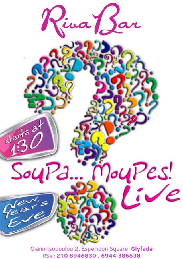 Το πάρτι στο Riva δεν σταματά ποτέ. Το απόγευμα οι 7AND απογειώνουν το κέφι, για να πάρουν σκυτάλη το βράδυ οι Soupa Moupes. Ακριβώς! Δύο events σε μια ημέρα για το αγαπημένο στέκι της Γλυφάδας, που θα αποτελέσει και αυτή την ξεχωριστή ημέρα το επίκεντρο της διασκέδασης. Η πλατεία Εσπερίδων βάζει τα καλά της και υποδέχεται το 2015 με πολύ μουσική και τον πλέον εορταστικό τρόπο. Το πάρτι ξεκινά 1.30 μετά τα μεσάνυχτα. Να πάτε και λίγο σπίτι σας.