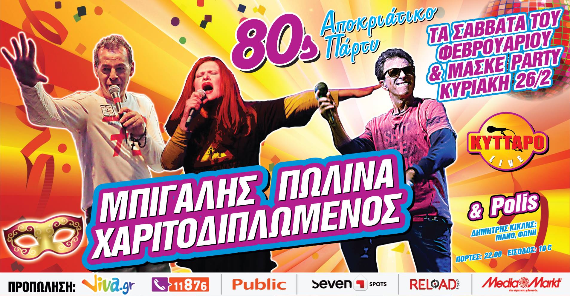 Αυτή η μοναδική παρέα, που τα τελευταία χρόνια σαρώνει τα πάντα στο πέρασμα της που δεν έχει αφήσει άνθρωπο για άνθρωπο καθιστό, με την συνδρομή των εκρηκτικών Polis και του showman Δημήτρη Κίκλη θα μας ξεσηκώσουν με τις αμέτρητες επιτυχίες τους για πέντε μοναδικά αποκριάτικα 80s-90s live happenings μέχρι τελικής πτώσης.