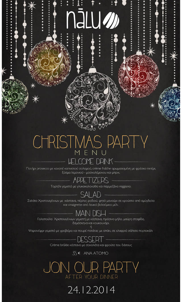 Χωρίς να υπερβάλλουμε, είναι ένας από τα πιο hot spot των Νοτίων Προαστίων. Το έχουμε αγαπήσει για την θαλασσινή του τοποθεσία, τις ξένοιαστες στιγμές που μας έχει προσφέρει και φυσικά τον υπέροχο κόσμο του. Τα φετινά Χριστούγεννα δεν θα μπορούσαν να ξεκινήσουν χωρίς να εντάξουμε το Nalu για ακόμη μια φορά στις στιγμές. Έτσι και αυτή τη φορά, μέσα σε χαρούμενο κλίμα, ζεστή ατμόσφαιρα και εορταστικό δείπνο, το Nalu μας προσκαλεί να γιορτάσουμε μαζί του, τα Χριστούγεννα της φετινής χρονιάς. Με ένα πλούσιο και εξίσου γευστικό μενού, το Nalu θα αρχίσει τους εορτασμούς των Χριστουγέννων από νωρίς το βράδυ και θα συνεχίσει μετά τα μεσάνυχτα με τις καλύτερες μουσικές επιλογές του Δημήτρη Φραγκούλη, σε ένα πάρτι που θα κρατήσει μέχρι τις πρώτες πρωινές ώρες. Τιμή μενού: 35 ευρώ ανά άτομο.