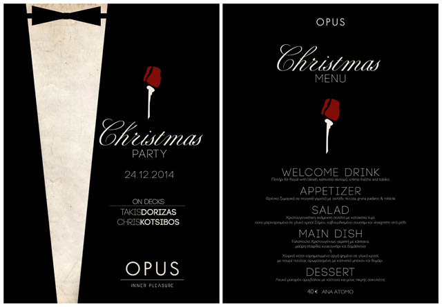 Χωρίς το OPUS, ένα από τα μεγαλύτερα μαγαζιά της Γλυφάδας που κερδίζει το κοινό του κάθε εποχή, τα Χριστούγεννα θα ήταν ελλειπή. Και κάπως έτσι, στις 24/12, το OPUS διοργανώνει για όλους εμάς ένα μοναδικό Χριστουγεννιάτικο πάρτι, στο οποίο θα ξεχωρίζει το καλό φαγητό, η classy εορταστική διάθεση και φυσικά το ιδιαίτερο, απολαυστικό και επηρεασμένο από elegant χριστουγεννιάτικες γεύσεις μενού, για μια Χριστουγεννιάτικη συνταγή που κάνει τη διαφορά. Άλλωστε το OPUS, έχει εδώ και καιρό «παράσημα» στο πέτο όσον αφορά τη νυχτερινή διασκέδαση και ξέρει ακριβώς τον τρόπο για να το κάνει. Όλα αυτά, με εκλεκτή mainstream μουσική, για όλους όσους έχουν σκοπό να το…ξημερώσουν! Τιμή μενού: 40 ευρώ ανά άτομο.