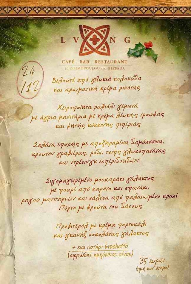 Το καφέ-μπαρ-ρέστοραν Living βάζει τα καλά του για να υποδεχτεί τα Χριστούγεννα. Για αυτό και αυτή την Τετάρτη ετοιμάζει ένα ειδικό μενού, με 35 ευρώ ανά άτομο. Σκέφτεστε κάτι καλύτερο από ένα χριστουγεννιάτικο ρεβεγιόν στην οδό Ζησιμοπούλου; Οι γαστρονομικές επιλογές, εξάλλου, κεντρίζουν το ενδιαφέρον. Από τη βελουτέ με γλυκιά κολοκύθα και κρέμα ρικότας ως τα χειροποίητα ραβιόλα γεμιστά με άγρια μανιτάρια και από το μοσχαράκι γάλακτος με το ραγού μανιταριών ως το προφιτερόλ με γεύση πορτοκάλι και γκανάζ σοκολάτας γάλακτος. Αν σ’ αυτά πορσθέσουμε το ποτήρι brachetto και το ούτως ή άλλως easy going περιβάλλον του Living, τότε το παλζ συμπληρώνεται υποδειγματικά.
