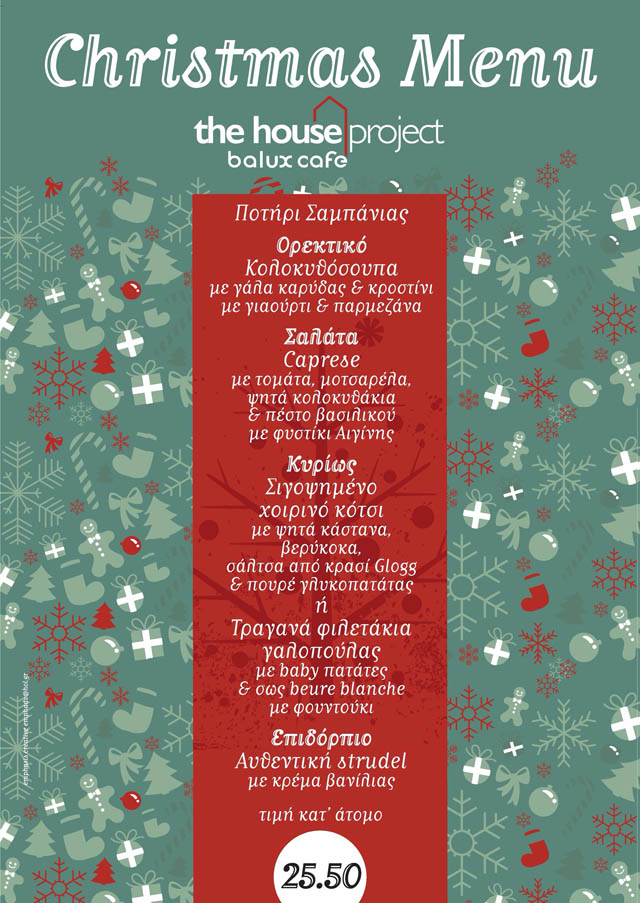 Στον πλήρως ανανεωμένο και ανακαινισμένο του χώρο, το Balux: The House Project, μας καλεί να μοιραστούμε μαζί την παραμονή των Χριστουγέννων, προσφέροντας μοναδικές εμπειρίες μέσα από το εορταστικό του μενού. Όλη η μαγεία των Χριστουγέννων, θα φιλοξενηθεί μέσα σε 5 απολαυστικά πιάτα, που συνδυάζουν την υπέροχη γεύση με την εορταστική διάθεση. Από την κολοκυθόσουπα με γάλα καρύδας μέχρι τη σαλάτα Caprese με μοτσαρέλα και το σιγοψημένο χοιρινό κότσι, το Balux υπόσχεται ένα γευστικό, άκρως εορταστικό αλλά και οικονομικό μενού, για όσους επιθυμούν να περάσουν την παραμονή Χριστουγέννων με τον καλύτερο τρόπο. Τιμή: 25,50 ανά άτομο.