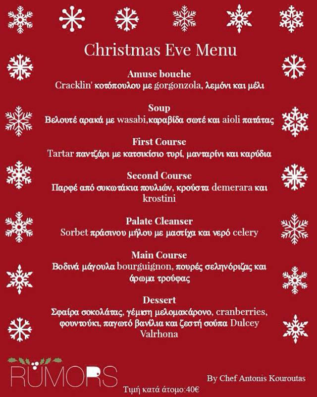 Μετά το περσινό γευστικό εορταστικό του μενού, ο chef Αντώνης Κουρκούτας έχει ετοιμάσει ακόμη ένα σύνολο απολαύσεων και για τα φετινά Χριστούγεννα. Το Rumors μας περιμένει την παραμονή των Χριστουγέννων στον ατμοσφαιρικό του χώρο και τις ακόμη καλύτερες γεύσεις, για να εδραιωθεί ακόμη μια φορά ως το απόλυτο στέκι της Βουλιαγμένης. Με 7 απολαυστικά και γιορτινά πιάτα να παρελαύνουν στο Χριστουγεννιάτικο του μενού, το Rumors υπόσχεται την απόλυτη εορταστική εμπειρία για εμάς και όλα τα αγαπημένα μας πρόσωπα. Και τη φετινή παραμονή των Χριστουγέννων, το αγαπημένο spot της Βουλιαγμένης, υπόσχεται να γεμίσει τη βραδιά μας με χαμόγελα, χρώματα και υπέροχες γεύσεις. Τιμή: 40 ευρώ ανά άτομο.