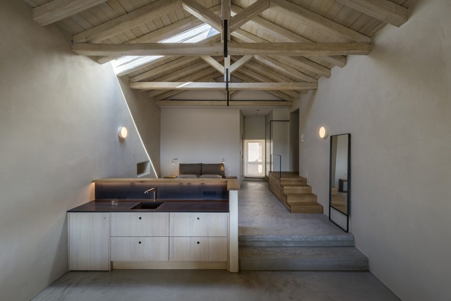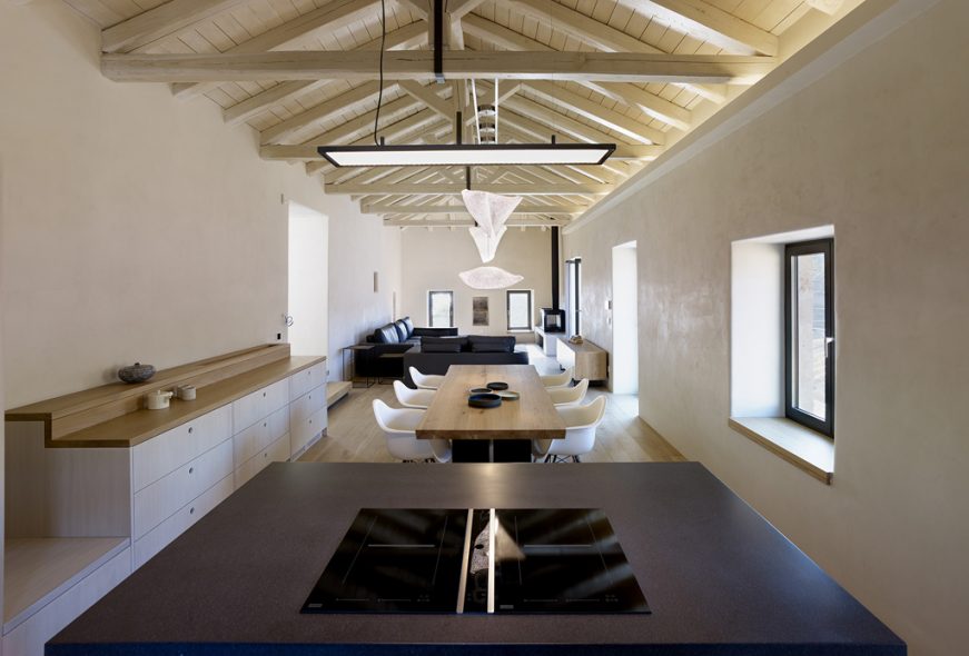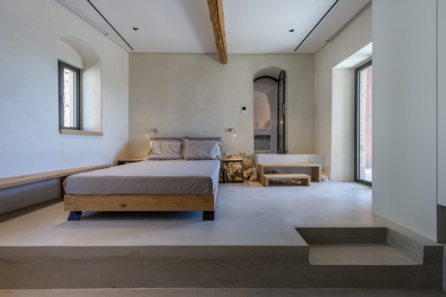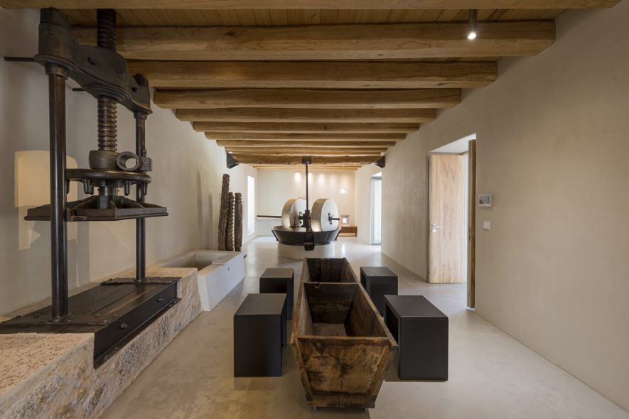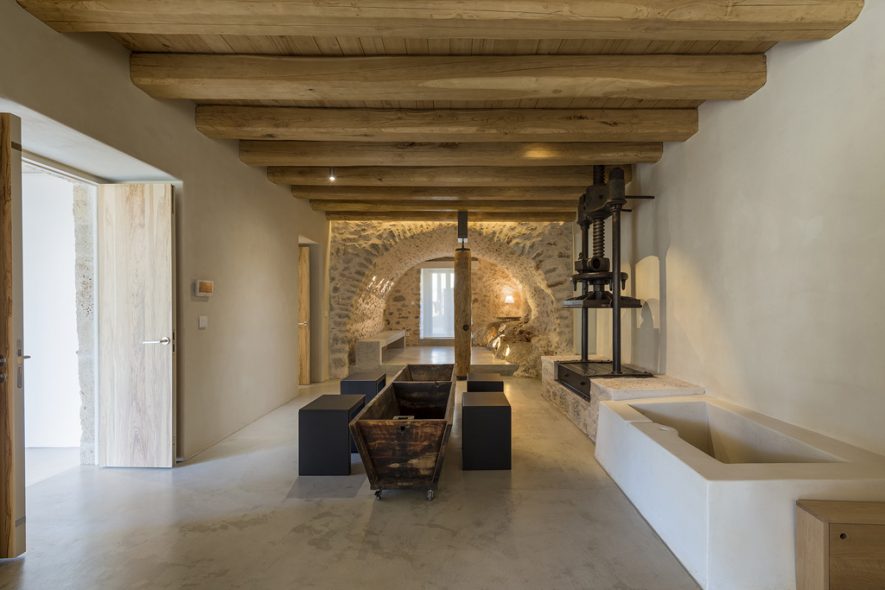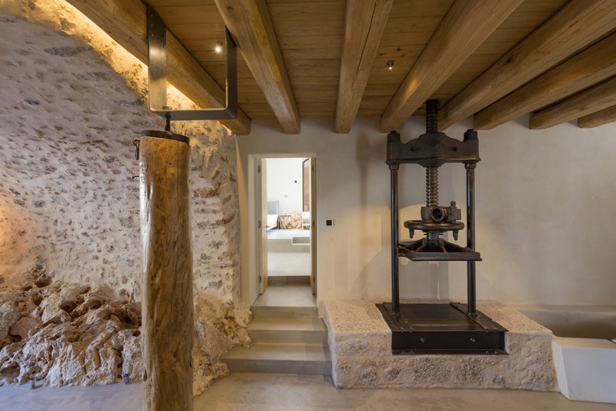Η εξερεύνηση των εσωτερικών χώρων της βίλας ξεκινά και καταλήγει στο παλιό λιοτρίβι. Η μινιμαλιστική αισθητική, τα φυσικά υλικά όπως το ξύλο και οι γήινοι τόνοι πρωταγωνιστούν και στα τέσσερα υπο-διαμερίσματα του σπιτιού: στα ψηλά ταβάνια με τα στιβαρά ξύλινα δοκάρια, στην εντυπωσιακή ανοιχτή κουζίνα και την κομψή τραπεζαρία, στα υπέροχα ξύλινα πατώματα, στο καθιστικό με το τζάκι σε πρώτο πλάνο, στα τρία master υπνοδωμάτια (όλα με en-suite μπάνιο).