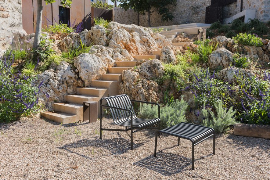 Οι αυλές, οι βεράντες και οι κήποι της βίλας συνθέτουν ένα ιδιωτικό παραμυθένιο βασίλειο που εκτείνεται σε αρκετά επίπεδα, περιβάλλεται από έναν ζωντανό ελαιώνα και βλέπει πανοραμικά τη θάλασσα. Μοναδικό χαρακτηριστικό των κήπων της βίλας αποτελούν οι βράχοι που αναδύθηκαν κατά την εκσκαφή στους περιβάλλοντες χώρους και μετατράπηκαν σε γλυπτά παρτέρια.
