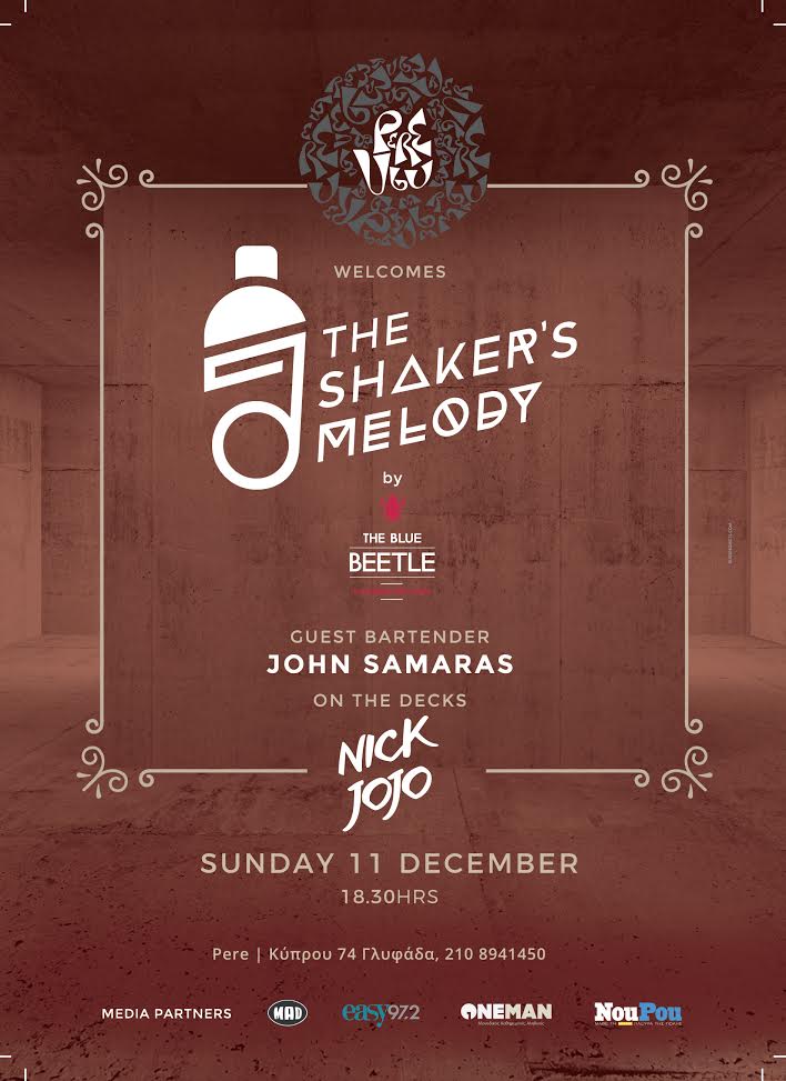 Την Κυριακή 11 Δεκεμβρίου θα πιεις γευστικά cocktails με groovy μουσική στη Γλυφάδα και λίγο μετά τις 18:30, το Τhe Shaker’s Melody by The BlueBeetle έρχεται στο αγαπημένο μας PERE.