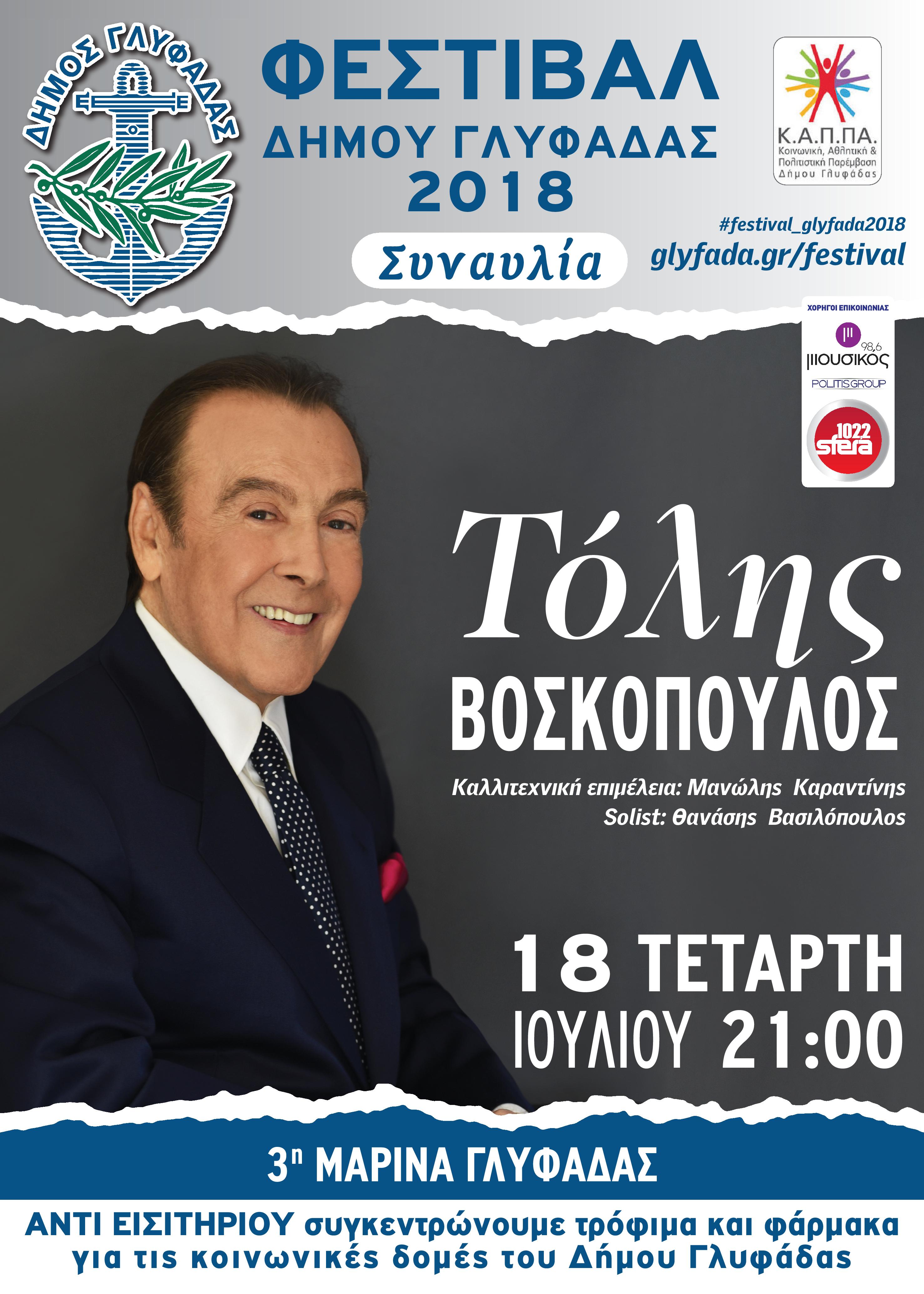 Στα πλαίσια του Φεστιβάλ Γλυφάδας 2018, θα τραγουδήσει ο ένας και μοναδικός Τόλης Βοσκόπουλος.