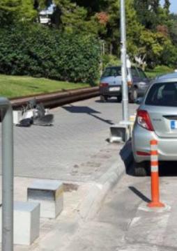 Ένα αυτοκίνητο έσπασε πέντε κολωνάκια και ανέβηκε πάνω στο πεζοδρόμιο καταστρέφοντας το ψυγείο του καθώς και τον προφυλακτήρα του. Οι μπροστινές ρόδες έχουν μπει σχεδόν μέσα στο φρεάτιο αφού κατάφερε να ραγίσει την προστατευτική σχάρα. Φυσικά αυτό συνέβη εξαιτίας της υπερβολικής ταχύτητας του οχήματος.