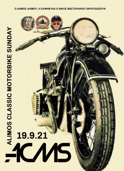 Επίσης, την Κυριακή 19 Σεπτεμβρίου, ο Δήμος Αλίμου, σε συνεργασία με την Ελληνική Λέσχη Φίλων Κλασικής Μοτοσικλέτας και τον Νίκο Μαστοράκη, διοργανώνει την πρώτη Alimos Classic Motorbike Sunday όπου τόσο οι φανατικοί του είδους όσο και οι απλώς περίεργοι, θα βρεθούν κοντά σε πάνω από 100 δείγματα «μηχανών» μεγάλης ηλικίας αλλά και μεγάλου κυβισμού. Από Vespa μέχρι Harley, όλο το φάσμα θα ‘απλωθεί’, για 5 ώρες στον πεζόδρομο.