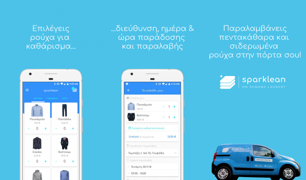 Πρόκειται για την πιο εύκολη διαδικασία καθαριστηρίου που έζησες ποτέ, από την άνεση του σπιτιού σου. Το μόνο που χρειάζεται να κάνεις είναι να κατεβάσεις την εφαρμογή (ή να μπεις από τον υπολογιστή σου στο Sparklean.gr) και να δημιουργήσεις σε μόλις λίγα δευτερόλεπτα τον λογαριασμό σου. Στη συνέχεια, επιλέγεις τα ρούχα που θέλεις (έχει διαχωρισμό σε αντρικά και γυναικεία) ή την εξίσου βολική κατηγορία «σπίτι», όπου επιλέγεις από την μάλλινη κουβέρτα μέχρι το μαξιλάρι σου. Τέλος, προσθέτεις την τοποθεσία που θα τα παραλάβει και θα τα παραδώσει το βαν της Sparklean, αλλά και την ώρα, από τις 7:30 μέχρι και τις 20:30 όλες τις καθημερινές, σε time slot ανά μισάωρο. Υπάρχει και η επιλογή του Σαββάτου, από τις 10:00 μέχρι τις 15:00.