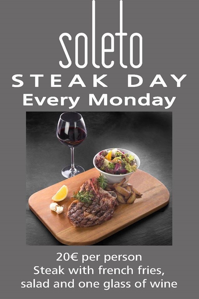 Αν δεν σου αρέσει η πολυκοσμία, η Δευτέρα είναι μια πάρα πολύ καλή μέρα για να βγεις. Οι περισσότεροι κάθονται σπίτι τους, οπότε δεν υπάρχει κανένα πρόβλημα ούτε για να βρεις πάρκινγκ, ούτε για να βρεις τραπέζι αλλά κυρίως δεν αργείς να φας αυτό που έχεις παραγγείλει. Πλέον άλλος ένας λόγος προστίθεται στη Δευτεριάτικη τριάδα εξόδου. Η steak day του Soleto. Κάθε Δευτέρα μπορείς να απολαύσεις ένα πιάτο με γευστική μπριζόλα και τηγανιτές πατάτες συνοδεία πράσινης σαλάτας και ένα ποτήρι κρασί στην υγειά σου με 20€! Bon appétit!