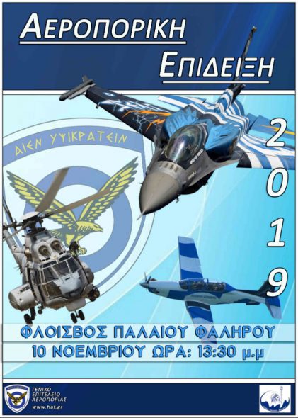Την Κυριακή 10 Νοεμβρίου 2019 και ώρα 13:30, στον Φλοίσβο Παλαιού Φαλήρου, θα πετάξουν και θα παρουσιάσουν το εντυπωσιακό τους πρόγραμμα οι Ομάδες Αεροπορικών Επιδείξεων Μεμονωμένου Αεροσκάφους F-16 «Ζευς» και T-6A TEXAN II «Δαίδαλος», προσφέροντας μοναδικό θέαμα.