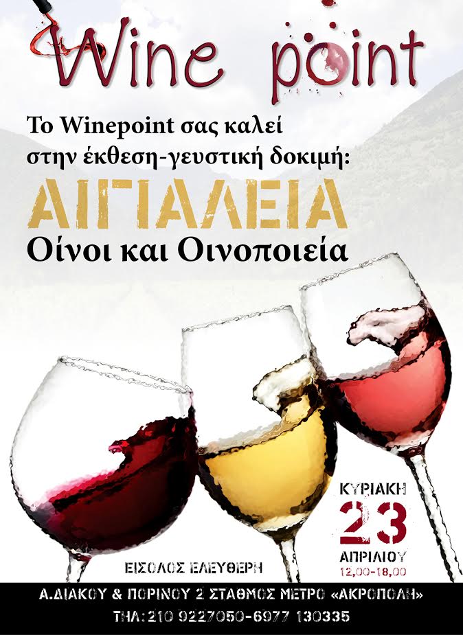 Την Κυριακή 23/4 από τις 12.00 έως τις 18.00 το Winepoint διοργανώνει έκθεση-γευστική δοκιμή με θέμα: Αιγιαλεία, Οίνοι και Οινοποιεία.