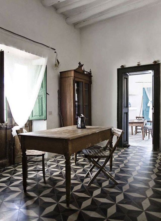 Τα vintage πλακάκια αναλαμβάνουν το ρόλο του χαλιού, της διαμόρφωσης διαδρόμου στο χώρο, της ταπετσαρίας, ντύνουν τραπέζια, παγκάκια, σκαλοπάτια (στο πάτημα ή στο ρίχτι), χτιστές ντουζιέρες ακόμη και την πισίνα και σχηματίζουν ψηφιδωτά που σε προκαλούν να τα εξερευνήσεις.