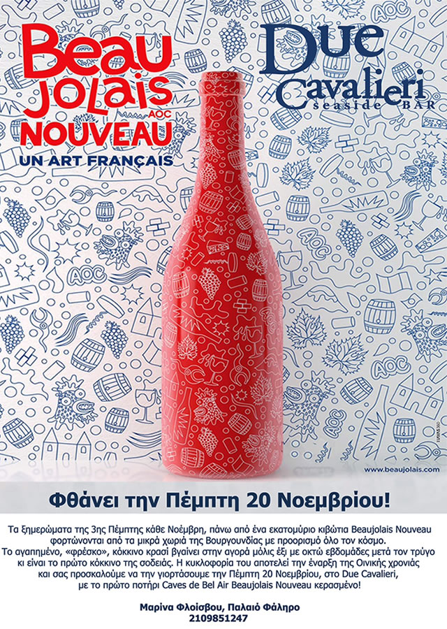 Το έθιμο ξεκινησε στις αρχές του 20ου αιώνα στο Παρίσι κι εξαπλώθηκε σε ολόκληρο τον κόσμο. Κάθε τρίτη Πέμπτη του Νοέμβρη. Σήμερα δηλαδή. Το Due Cavalieri παίρνοντας μέρος στον παγκόσμιο θεσμό (που έχει γνωρίσει μεγάλη επιτυχία στη Γαλλία και στην Αγγλία) κερνάει όλο τον κόσμο το πρώτο ποτήρι κρασί, άσχετα με το αν θα συνεχίσει μετά με δεύτερο.