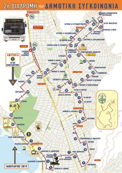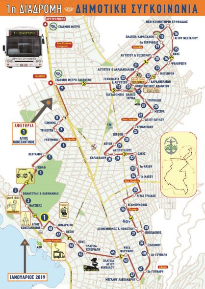 Η πρώτη διαδρομή της δημοτικής συγκοινωνίας ξεκινά από τον Άγιο Κωνσταντίνο (ΕΛΤΑ), περνά από την Ευρυάλη και το σταθμό μετρό «Ελληνικό», ανεβαίνει στην Τερψιθέα, συνεχίζει στην Αγία Τριάδα και την Αιξωνή και καταλήγει στην αφετηρία, μέσω της οδού Κύπρου.