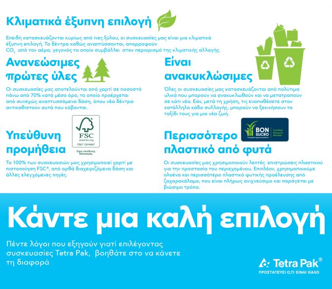 Η Tetra Pak μας προσφέρει χάρτινες συσκευασίες που μας βοηθούν να κάνουμε τη διαφορά, με βιώσιμες επιλογές για το περιβάλλον.