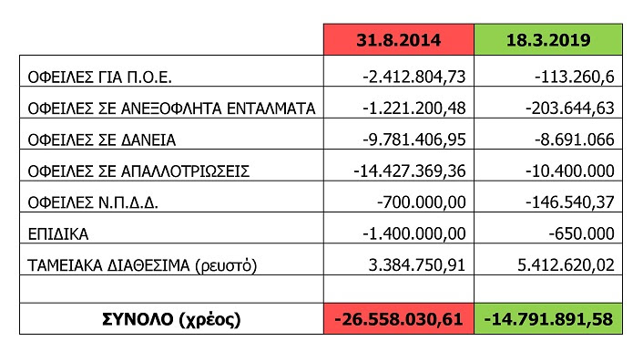 Όπως φαίνεται και στον πίνακα, στις 31.8.2014 η συνολική καθαρή θέση του Δήμου (χρέος) ανερχόταν στα 26.558.030,61 €. Στις 18.3.2019 η συνολική καθαρή θέση (χρέος) είχε μειωθεί στα 14.791.891,58 €. Δηλαδή ο Δήμος μείωσε τις οφειλές του (χρέος) κατά 45% !