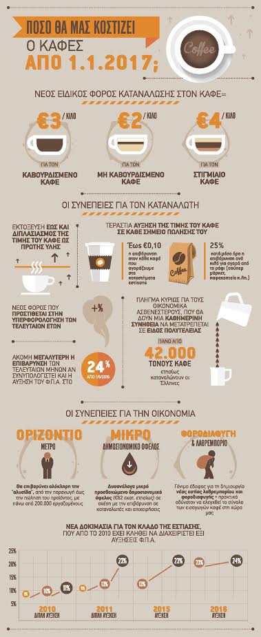 Από την 1η Ιανουαρίου 2017, έρχονται αυξήσεις στον καφέ τόσο στα καταστήματα εστίασης όσο και από τα καταστήματα λιανικής. Όποιον καφέ και αν πίνεις, είτε πίνεις στο σπίτι, είτε στο γραφείο, είτε στο αγαπημένο σου καφέ, έρχεται μία αύξηση να προστεθεί στην τιμή του. Ήδη από το 2010 που υπήρξε μία διπλή αύξηση Φ.Π.Α.Α και από το 9% βρέθηκε στο 11% και μετά από έξι αυξήσεις, πλέον βρίσκεται στο 24%. Σε μία χώρα που ετησίως καταναλώνει 42.000 τόνους καφέ, η επιπλέον αύξηση φαντάζει εξωφρενική καθώς έρχεται ακόμη μία οικονομική επιβάρυνση.