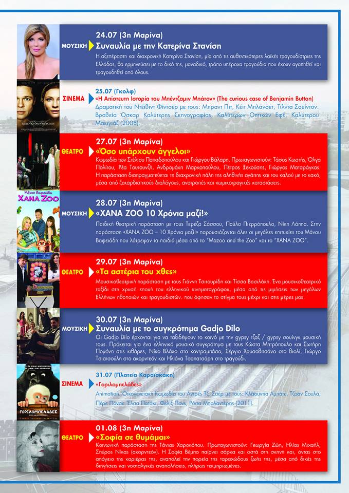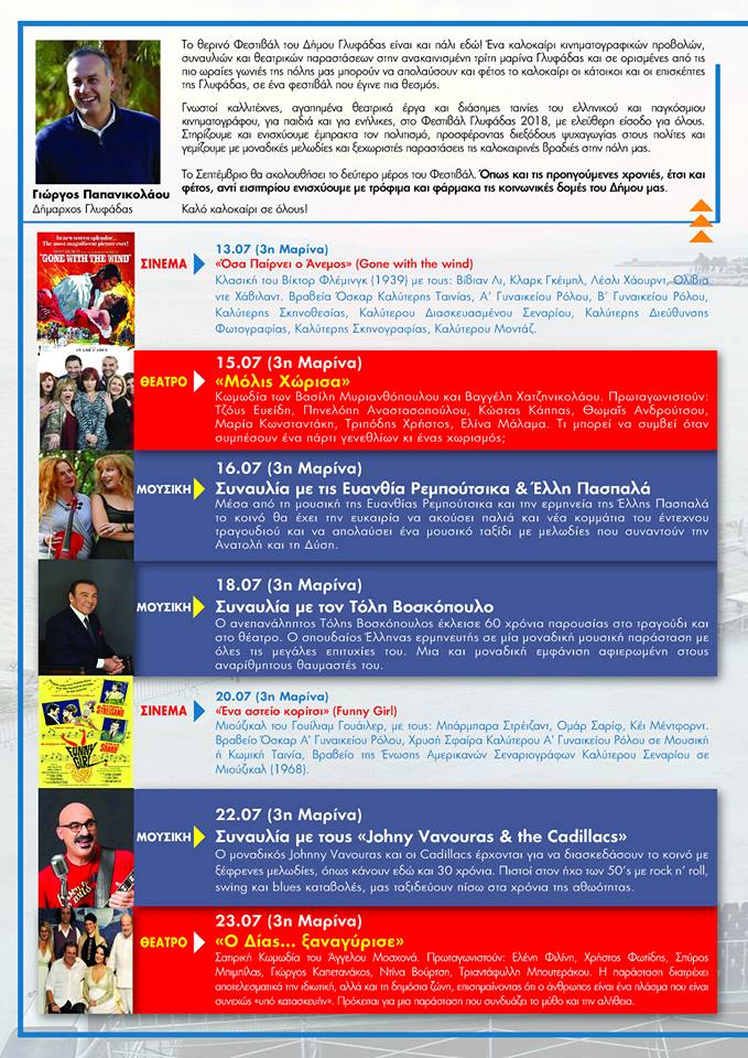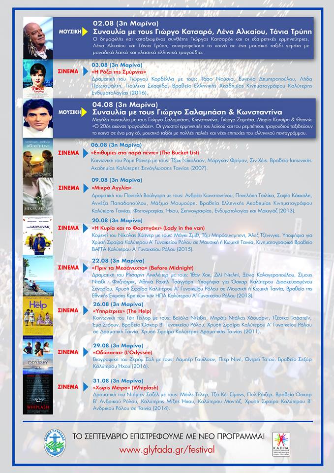 Σας περιμένουμε στην ανακαινισμένη 3η Μαρίνα Γλυφάδας, σε ένα μοναδικό χώρο που έχουμε δημιουργήσει δίπλα στη θάλασσα, αλλά και με προβολές ταινιών σε κάποιες όμορφες γωνιές της πόλης μας, με ώρα έναρξης για όλες τις εκδηλώσεις στις 9 το βράδυ και είσοδο δωρεάν.