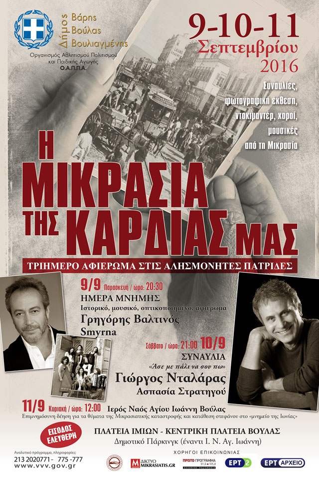 Τριήμερο εκδηλώσεων μνήμης για το Μικρασιατικό Ελληνισμό με τίτλο, «Η Μικρά Ασία της καρδιάς μας» διοργανώνει ο Δήμος Βάρης Βούλας Βουλιαγμένης και ο Οργανισμός Αθλητισμού Πολιτισμού και Παιδικής Αγωγής του Δήμου (ΟΑΠΠΑ), για δεύτερη συνεχή χρονιά στις 9, 10 & 11 Σεπτεμβρίου.