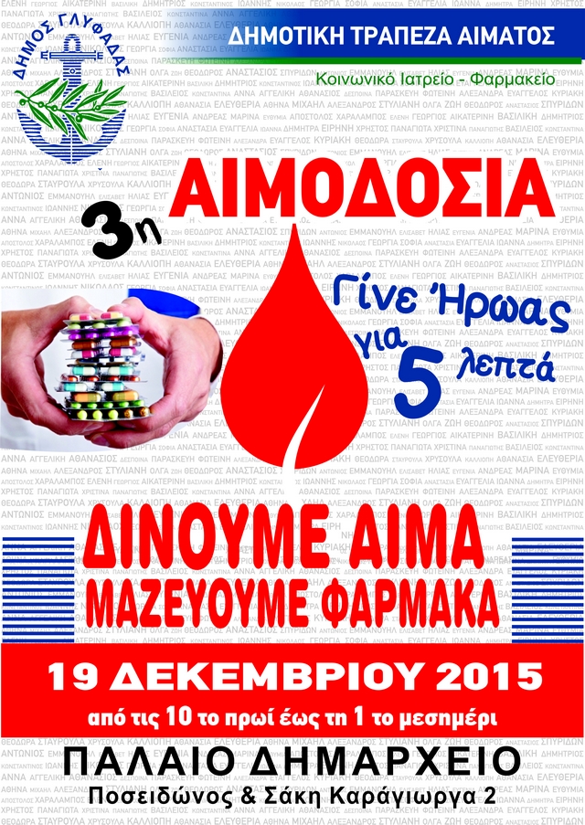 Για τρίτη φορά μες στη χρονιά ο Δήμος Γλυφάδας πραγματοποιεί εθελοντική αιμοδοσία για την ενίσχυση της δημοτικής τράπεζας αίματος. Η αξιοθαύμαστη αυτή προσπάθεια έχει προγραμματιστεί για το Σάββατο 19 Δεκεμβρίου.