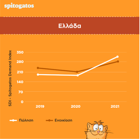 Συνολικά για την αγορά ακινήτων επισημαίνεται πως, μετά από την πτώση που παρατηρήθηκε το 2020 σε σχέση με το 2019 της τάξης του -8,3% στη ζήτηση ακινήτων προς ενοικίαση και -2,2% για ακίνητα προς πώληση, το 2021 η ζήτηση για ακίνητα προς πώληση σε όλη την επικράτεια εκτοξεύθηκε στο α’ τετράμηνο του 2021 κατά 61% ενώ η ζήτηση ακινήτων προς ενοικίαση αυξήθηκε κατά 30,5%.