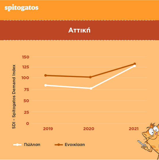 Παρόμοια αυξητική τάση σημειώθηκε και στην Αττική, με τη ζήτηση των ακινήτων προς πώληση να αυξάνεται σημαντικά κατά 65,2% το πρώτο τετράμηνο του 2021 σε σχέση με το 2020, ενώ αύξηση 28,2% παρατηρήθηκε στη ζήτηση ακινήτων προς ενοικίαση. Αξιοσημείωτο είναι ότι αυτή η αύξηση στη ζήτηση ακινήτων στην Αττική διαδέχθηκε την μείωση -5,2% στη ζήτηση ακινήτων προς ενοικίαση και -7,5% στη ζήτηση ακινήτων προς πώληση η οποία είχε καταγραφεί το πρώτο τετράμηνο του 2020.