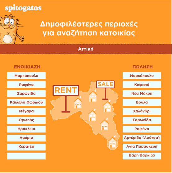 Σε ό,τι αφορά στη ζήτηση για ακίνητα προς ενοικίαση, στις 10 πιο δημοφιλείς περιοχές κατατάσσονται αρκετές παραθαλάσσιες περιοχές όπως η Ραφήνα, η Σαρωνίδα, ο Ωρωπός, η Ανάβυσσος και τα Μέγαρα.