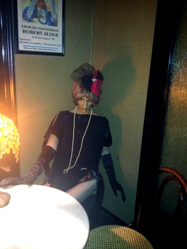 Ο Μιχάλης συνεχίζει «Βάζουμε τέτοια εδώ, λίγο ροκ αλλά παλιά, γενικά oldies, κυρίως τζαζ, swing», την ώρα εκείνη έπαιζε το Besame Mucho (που συμπαθάτε με για την άχρηστη πληροφορία, αλλά μου αρέσει τόσο ρε παιδιά). Από πίσω μας άλλη μία κούκλα (φίλη της Τζοζεφίν), η Ματίλντα, φοράει ένα κόκκινο φόρεμα και ένα όμορφο μαύρο καπέλο, την κοιτάω και ο Μιχάλης μου αποκαλύπτει την καλλιτεχνική του φύση «εγώ το έφτιαξα, μου αρέσει να φτιάχνω διάφορα και τα κεντήματα στον τοίχο δικά μου είναι».