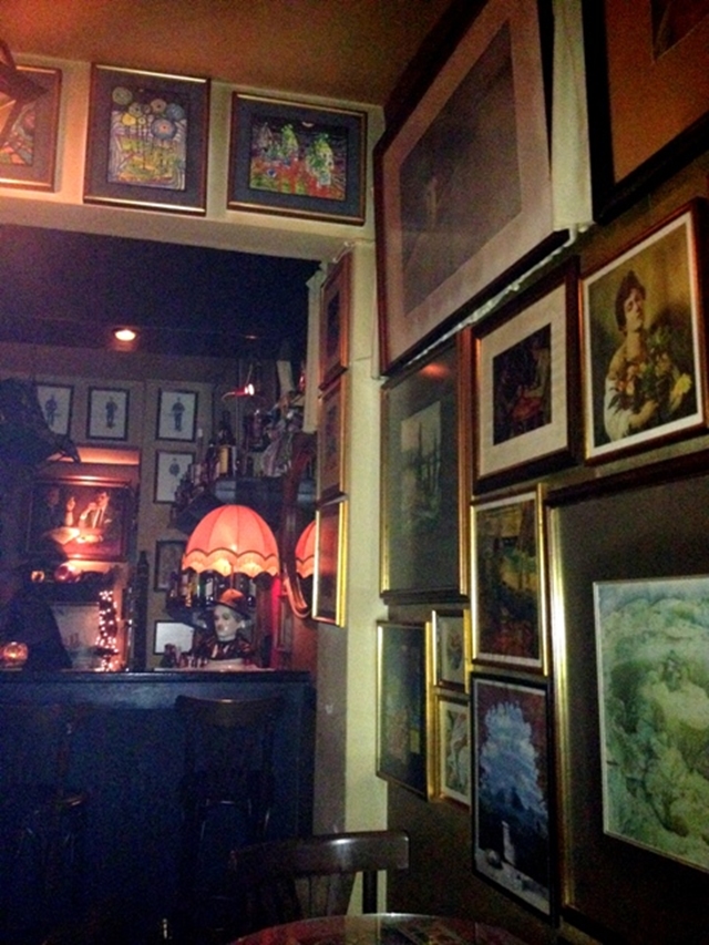 Καλά τώρα που είπαμε για τοίχους, πω πω, δεν υπάρχει αυτό που είδαν τα ματάκια μου, γεμάτοι από κάδρα, Νταλί, έργα ενός φίλου τους εικαστικού, αλλά και χαρακτικά, φωτογραφίες της Σίρλει Μπάσεϊ, του Χάμφρεϊ του Μπόγκαρτ (λέγε με Καζαμπλάνκα), του Τσάρλι Τσάπλιν (κατά κόσμον Σαρλό), τα περισσότερα δώρα από θαμώνες, Έλληνες, Αμερικάνους, Ελβετούς, Γάλλους. Αλλά το καλύτερο από όλα είναι ένας εξαιρετικός πίνακας πάνω από το μπαρ, που απεικονίζει τους δύο συνεργάτες σε νεαρότερη ηλικία. Εκεί από κάτω είδα και το τηλέφωνό τους, από αυτά τα τέλεια τα vintage ναι, πιο vintage δεν έχεις. «Και πολλά από τα αντικείμενα που έχουμε μας τα έχουν κάνει δώρο, κάποια άλλα τα έχω αγοράσει από το Μοναστηράκι». Βλέπω παλιά παιχνίδια και μουσικά όργανα κρεμασμένα από το ταβάνι. Και παλιά φανάρια δρόμου που χρησιμεύουν για σταντ. Βλέπω παντού κάτι. Παντού.