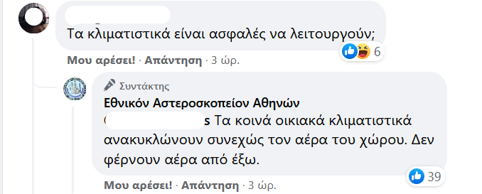 Εν τω μεταξύ, εκατοντάδες είναι τα μηνύματα κάτω από την ανάρτηση του Εθνικού Αστεροσκοπείου. Πολλοί ρωτούν μεταξύ άλλων αν είναι ασφαλές να χρησιμοποιούν το κλιματιστικό τους ή αν με τη χρήση τους μπορεί να μπει καπνός μέσα στο σπίτι. Σε ένα από τα σχόλια, η απάντηση που δόθηκε από το Αστεροσκοπείο ήταν: «Τα κοινά οικιακά κλιματιστικά ανακυκλώνουν συνεχώς τον αέρα του χώρου. Δεν φέρνουν αέρα απ’έξω».