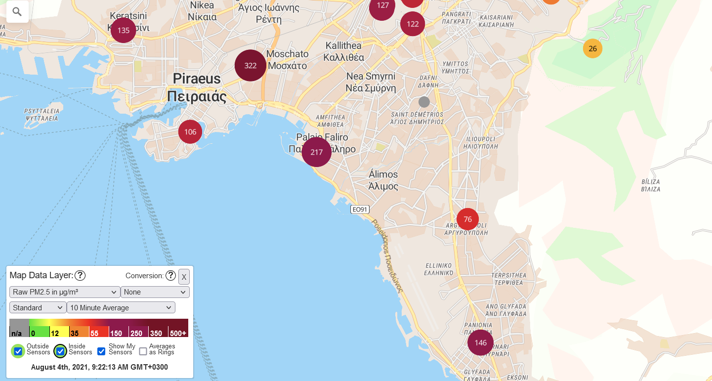 4 Αυγούστου 05:00: Η κατάσταση πλέον σε πολλές περιοχές της Αθήνας είναι άσχημη όσο αφορά τα επιβλαβή σωματίδια PM2.5…