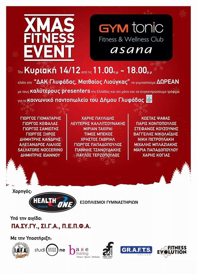 Την Κυριακή 14 Δεκεμβρίου, σε ένα special Xmas Fitness Event, από τις 11:00-18:00, γυμναζόμαστε δωρεάν και προσφέρουμε στο Κοινωνικό Παντοπωλείο του Δήμου Γλυφάδας.