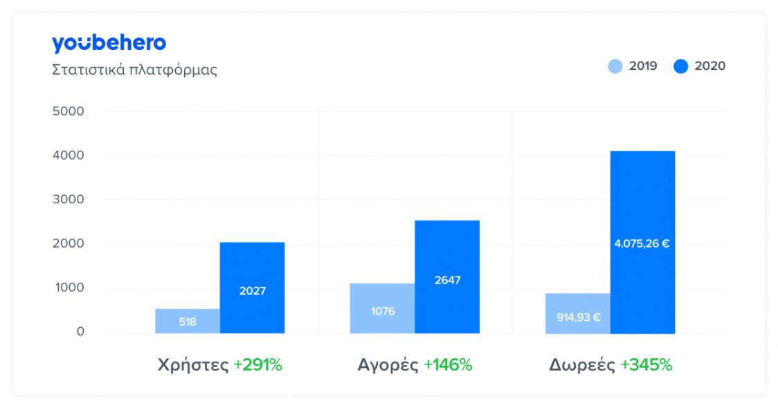 Μόνο το 2020 μέσα από τις αγορές στην πλατφόρμα συγκεντρώθηκαν 4,075.26€ από 2647 αγορές έναντι των 914.93€ που συγκεντρώθηκαν το 2019 από 1076 αγορές. Ταυτόχρονα, το 2020 αυξήθηκαν κατά 291% οι μοναδικοί επισκέπτες της «ηρωικής» πλατφόρμας φτάνοντας τους 2027, έναντι των 518 του 2019.