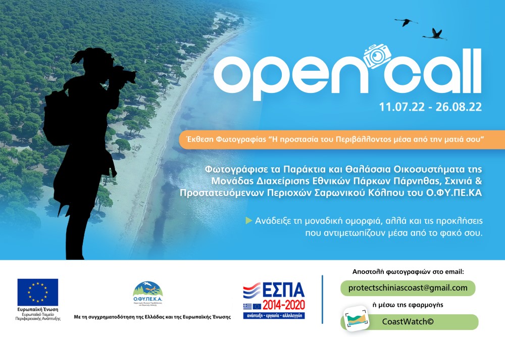 Ο Οργανισμός Φυσικού Περιβάλλοντος & Κλιματικής Αλλαγής (Ο.ΦΥ.ΠΕ.ΚΑ) και το MEDASSET- Μεσογειακός Σύνδεσμος για τη Σωτηρία των Θαλάσσιων Χελωνών καλούν ερασιτέχνες και επαγγελματίες φωτογράφους, αλλά και όλους τους λάτρεις της φύσης να συμμετέχουν με φωτογραφικό υλικό στην Έκθεση Φωτογραφίας για την ανάδειξη των προστατευόμενων περιοχών της Αττικής “Η προστασία του Περιβάλλοντος μέσα από την ματιά σου”.