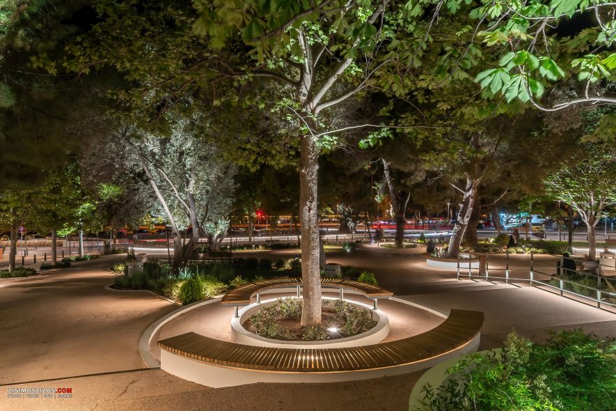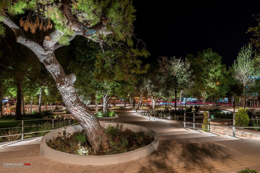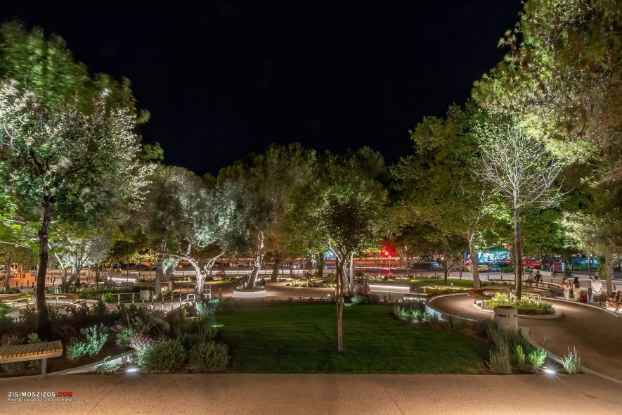 Η νυχτερινή όψη της πλατείας, είναι εξίσου εντυπωσιακή, λόγω του ειδικά μελετημένου φωτισμού της, που της δίνει ζωή. Πρόκειται για φωτισμό ανάδειξης των κεντρικών δέντρων μέσα και από την ενσωμάτωση φωτιστικών σε όλα τα καθιστικά, την ήπια ανάδειξη των διαδρομών βάσει της κατηγοριοποίησης τους σε κύριες και δευτερεύουσες, καθώς επίσης και των σημείων στάσης, συγκέντρωσης, ανάπαυλας και παιχνιδιού.