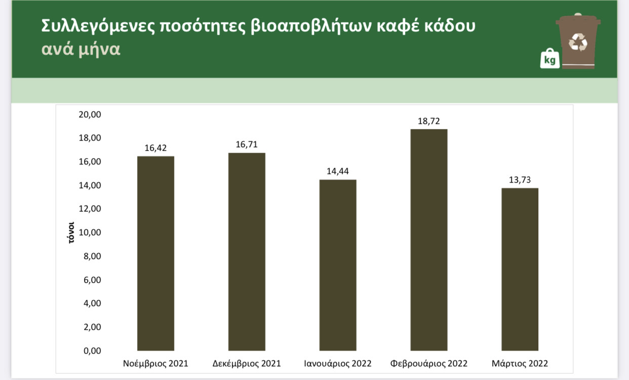 Επίσης, το πρόγραμμα συλλογής των βιοαποδομίσιμων υλικών, το οποίο ξεκίνησε με καφέ κάδους στις λαϊκές αγορές και στα καταστήματα εστίασης, θα επεκταθεί σταδιακά και στις γειτονιές της πόλης για την εξυπηρέτηση των νοικοκυριών.