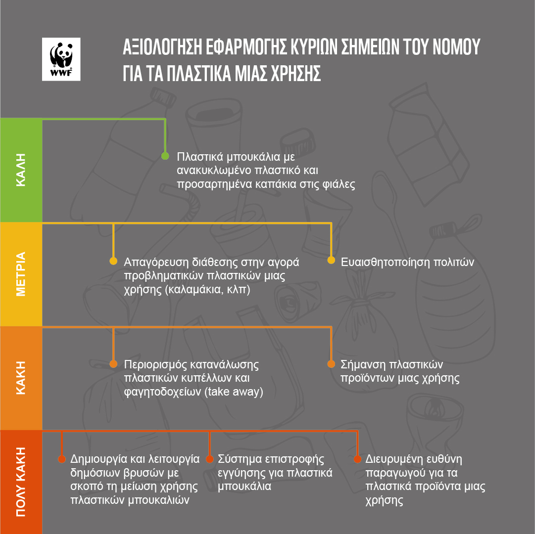 Την πρώτη έκθεση για την πορεία εφαρμογής του νόμου για τα πλαστικά μιας χρήσης δημοσίευσε το WWF Ελλάς. Σύμφωνα με αυτή, οι επιδόσεις της χώρας μας είναι απογοητευτικές. Με βάση τα στοιχεία, το μόνο θετικό σημείο που καταγράφηκε είναι η εφαρμογή κάποιων ρυθμίσεων του νόμου που αφορούν τα πλαστικά μπουκάλια, καθώς πολλές επιχειρήσεις έχουν κινητοποιηθεί και ήδη διαθέτουν στην αγορά πλαστικές φιάλες από PET που περιέχουν ανακυκλωμένο πλαστικό πάνω από 25%, αλλά και μπουκάλια με προσαρτημένα καπάκια.