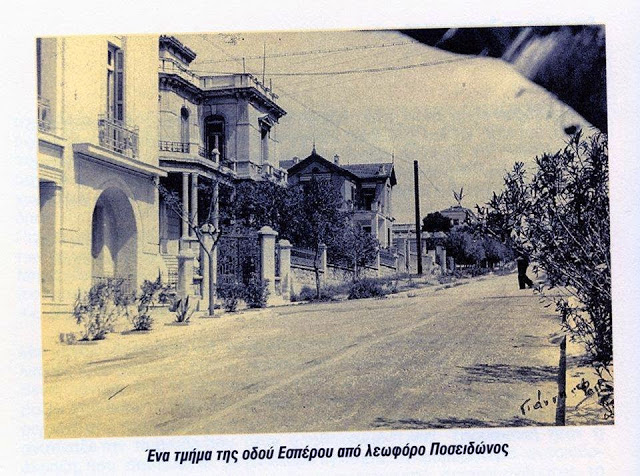 Παλαιό Φάληρο 1930. Η οδός Εσπέρου φωτογραφημένη από τη λεωφόρο Ποσειδώνος. Αριστερά το πρώτο κτήριο που φαίνεται ήταν το Ξενοδοχείον «Miramare Palace» – μετέπειτα «Carlton». Οικοδόμηση: πριν το 1928. Κατεδάφιση: 1966. Στη συνέχεια βλέπουμε το Μέγαρο Ηλία Αγγελή, Οδός Εσπέρου 4 & Αλκυόνης 1-5. Οικοδόμηση: 1900’s. Κατεδάφιση: 1970. To οικόπεδο έφτανε έως την Αγίου Αλεξάνδρου.