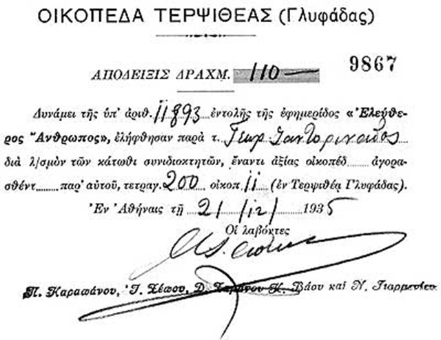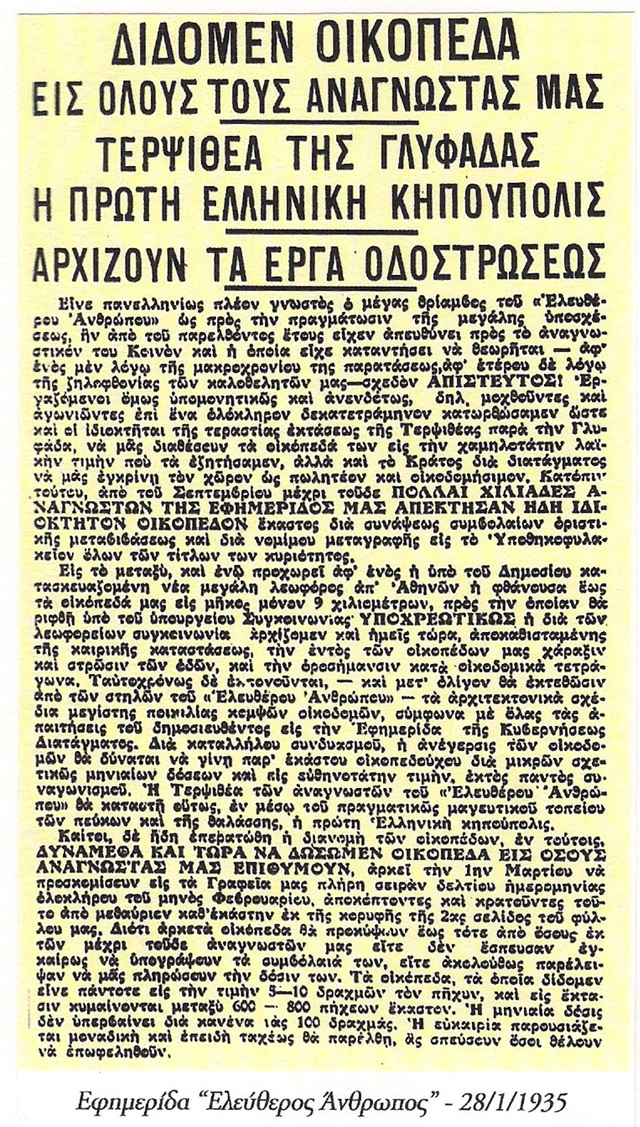 Η εφημερίδα "Ελεύθερος Άνθρωπος" τη δεκαετία του '30, έδινε κομμάτι γης στην περιοχή της Άνω Γλυφάδας, έναντι ορισμένων κουπονιών και ενός μικρού χρηματικού ποσού. Κάποιους δεν τους ενόχλησε καθόλου να μείνουν ανάμεσα σε βοσκοτόπια και έκαναν πραγματικά την τύχη τους!
