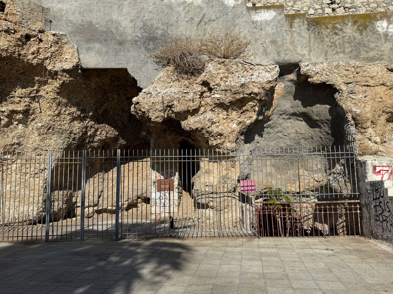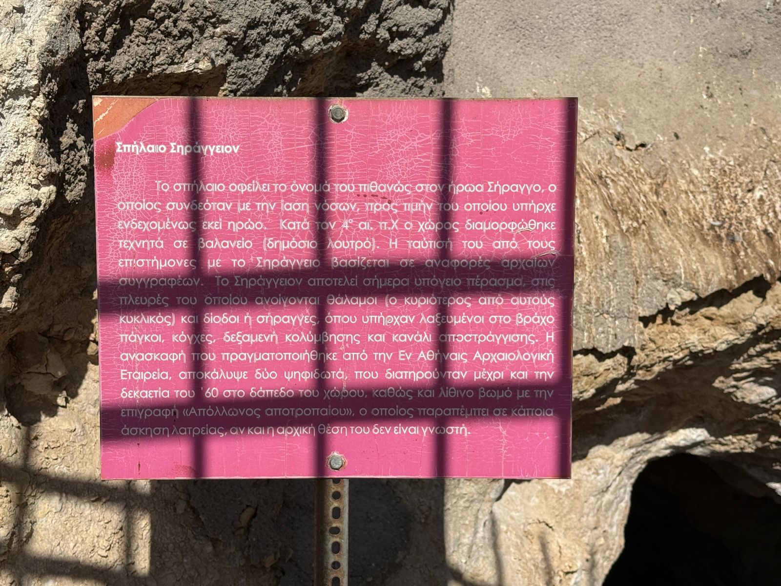 Ας πάρουμε όμως τα πράγματα από την αρχή. Η εικόνα της παραλία Βοτσαλάκια, δεν ήταν αυτή που βλέπουμε σήμερα. Οι επιχωματώσεις έχουν απομακρύνει την ακτή. Κάποτε το κύμα έσκαγε ακριβώς κάτω από τη σπηλιά. Για να ακριβολογούμε, η υπόγεια αυτή δίοδος λέγεται Σηράγγιο και έχει μεγάλο αρχαιολογικό ενδιαφέρον. Υπάρχουν αναφορές πως αποτελούσε λουτρό, με μικρά ξεχωριστά διαμερίσματα. Οι αίθουσες είχαν διακοσμηθεί με μωσαϊκά, που απεικόνιζαν θεότητες και μορφές της αρχαιότητας. Πρέπει να υπήρξε και χώρο λατρείας του θεού Απόλλωνα, αφού βρέθηκε βωμός και σχετική επιγραφή. Ως πρώτος ιδιοκτήτης του χώρου, θεωρείται ο ήρωας Σήραγγος, εξού και το όνομα του.