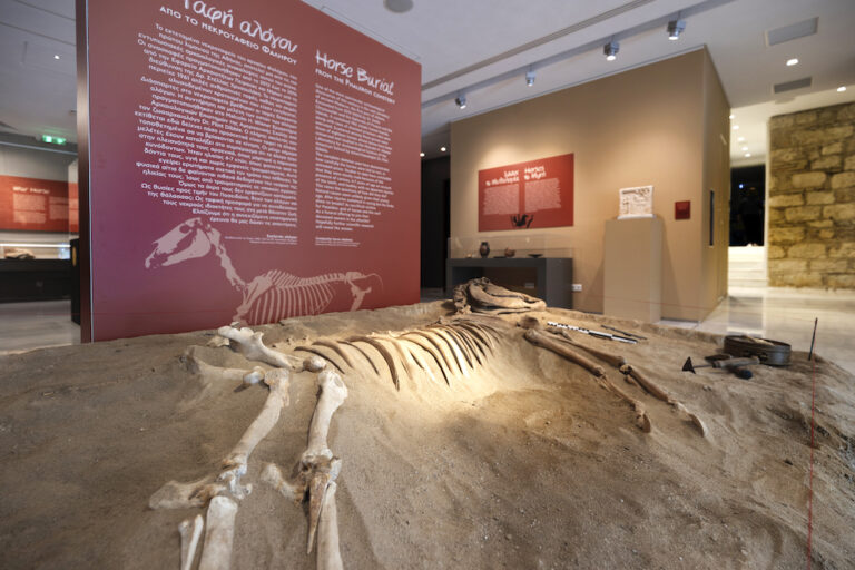 Κεντρικό έκθεμα ένας αρχαίος σκελετός αλόγου, από τις ανασκαφές του νεκροταφείου του Φαλήρου, ο οποίος βρέθηκε σε πολύ καλή κατάσταση. Μάλιστα, ήταν η πρώτη φορά που το εύρημα εκτέθηκε στο κοινό. Το οστεολογικό υλικό οκτώ εκ των σκελετών που βρέθηκαν συντηρήθηκε και μελετήθηκε στο Malcolm H. Wiener Εργαστήριο Αρχαιολογικών Επιστημών της Αμερικανικής Σχολής, όπου ο ζωοαρχαιολόγος Δρ. Flint Dibble μελέτησε την ηλικία, το φύλο και τη φυσική τους κατάσταση, φέρνοντας στο φως πληροφορίες για τα μυστηριώδη άλογα. Παρόλο που η κατάσταση των σκελετών αποκάλυψε τον τρόπο που πέθαναν, μια θεωρία υποστηρίζει ότι πρόκειται για θυσίες προς τιμήν του θεού Ποσειδώνα, γνωστού και με το επίθετο Ίππιος.6